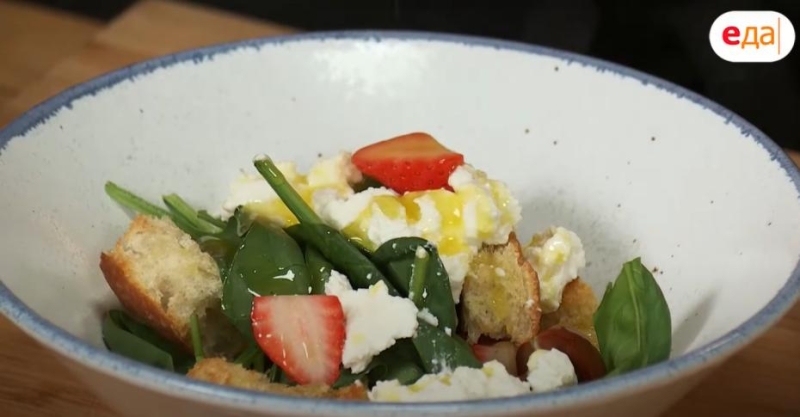 3. Отправьте в миску черри и клубнику, нарезанные пополам, свежий шпинат, запечённый хлеб и рикотту.