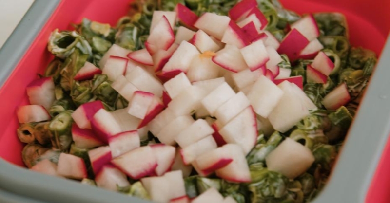 3. Редис нарежьте кубиком и добавьте к салату.